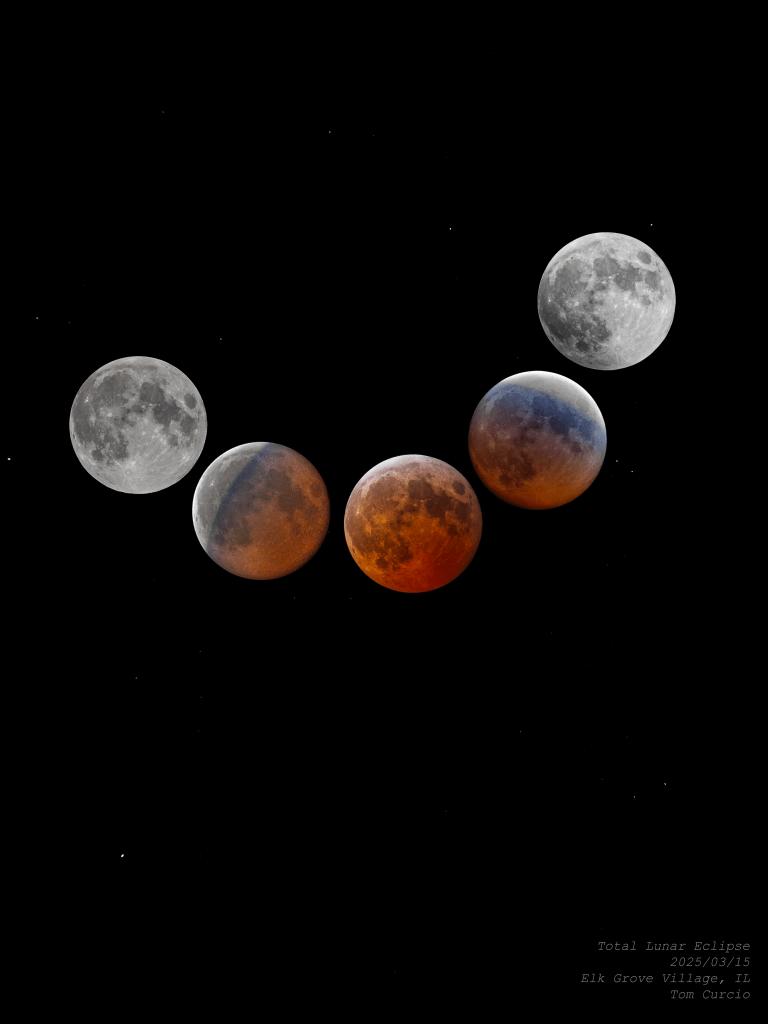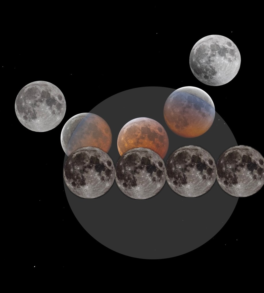 lunar eclipse = moon in shadow of earth (allegedly)an approximately accurate time composite of the eclipse phasesmy artistic attempt at measuring the comparative size of the moon using the circle of the shadow compared to the moon size – about 3.5x is what we’re looking for, and that’s about what I got.